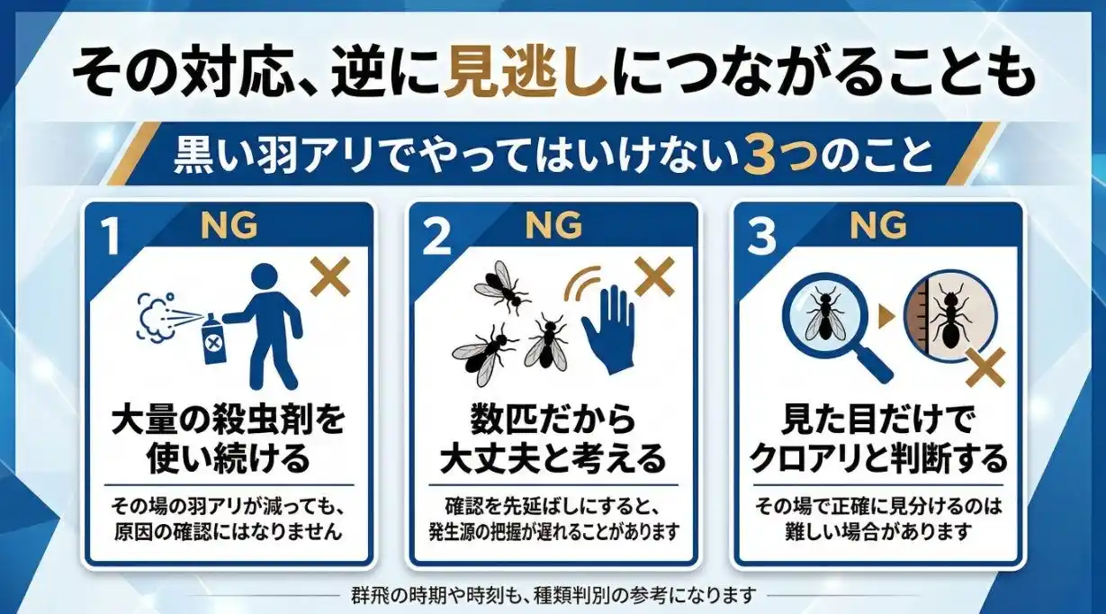 | 黒い羽アリは、一般の方がその場で正確に見分けるのが難しい場合があります。見た目だけで判断せず、発生時期、発生場所、羽アリの数、床下や木部の状態も含めて考えることが大切です。 | ||||||||