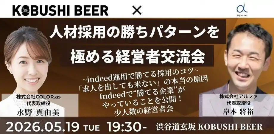 KOBUSHI MARKETING合同会社(東京都渋谷区、代表:井上裕介)が運営する渋谷道玄坂の『KOBUSHI BEER LOUNGE & BAR』では、人と人とを繋ぐユニークな取り組みを行い多くのビジネスチャンスを生み出している。今回、2026年5月19日(火)19:30~COLOR.as 水野代表・アルファ 岸本代表のコラボで、indeed運用で勝てる採用のコツについて共有する少人数経営者会を開催すると発表した。 |