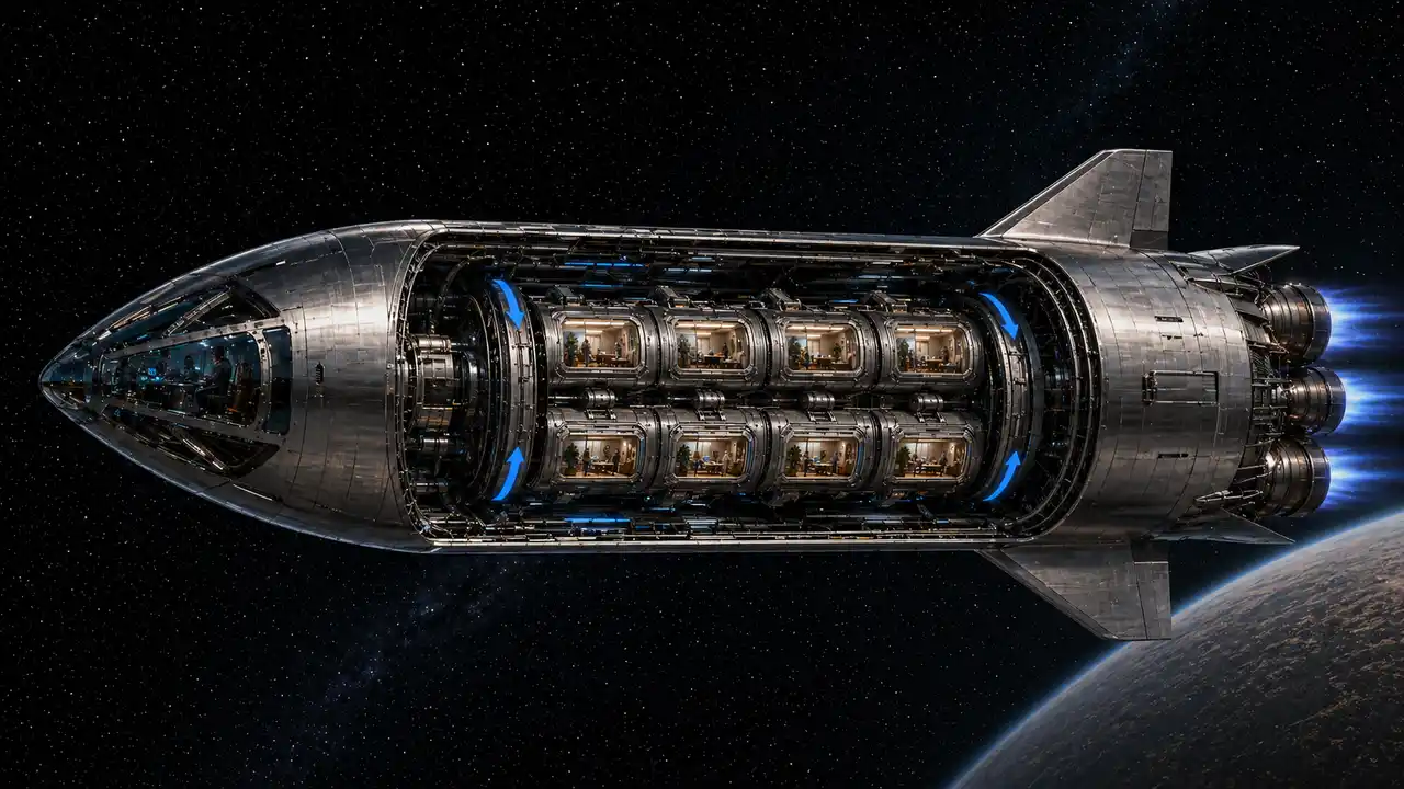 宇宙船内に同心円状の回転居住区を配置した人工重力構造のイメージ |