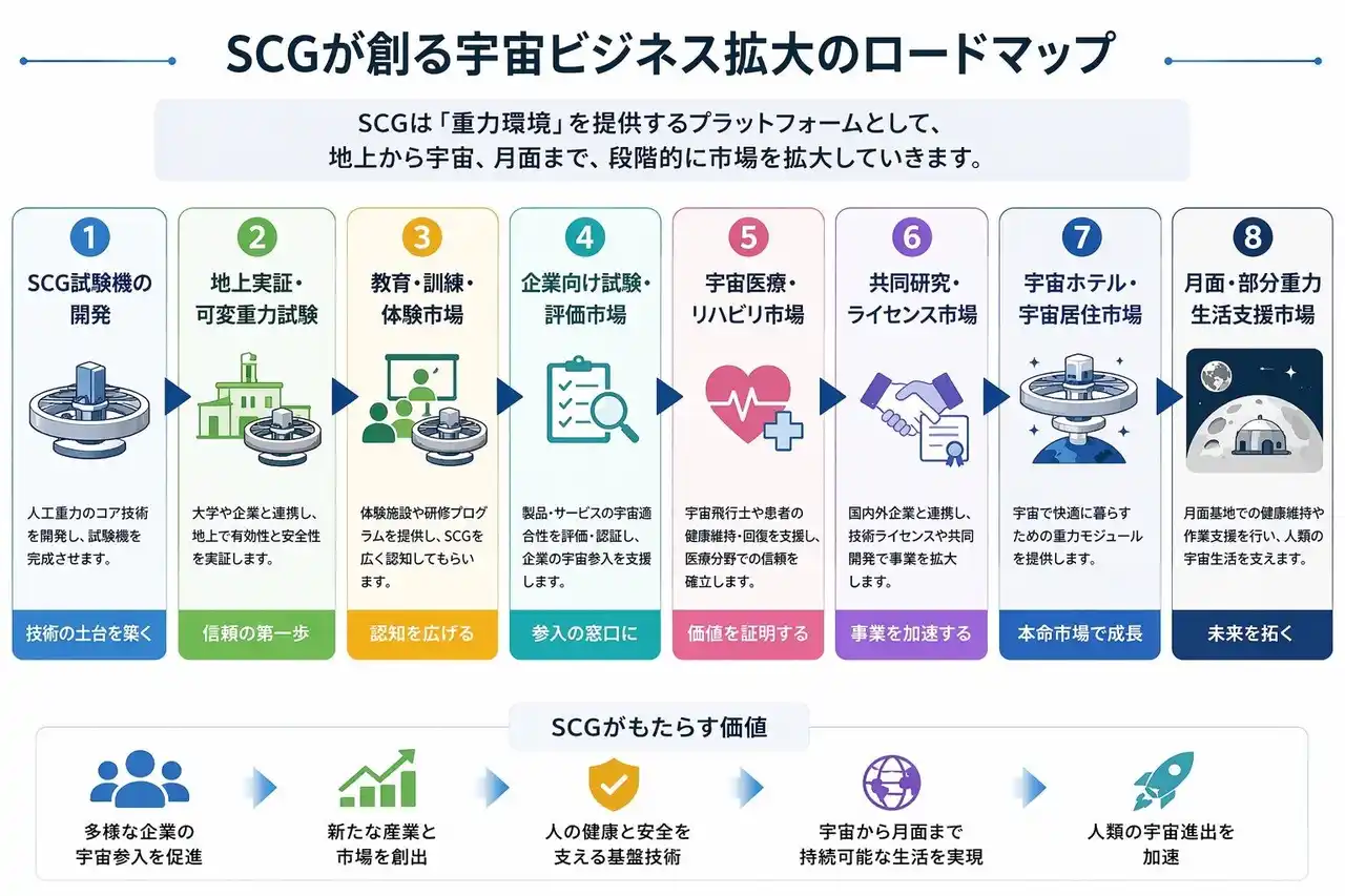SCGが目指す宇宙ビジネス拡大のロードマップ。地上実証から教育・訓練、企業評価、宇宙医療、共同研究、宇宙ホテル・月面生活支援まで、人工重力技術を基盤に段階的な市場創出を目指します。 |