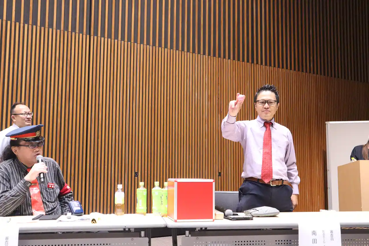 前回大会にて駅区間の抽選を行うゲストの鉄道BIG4南田氏とSUPER BELL''Z 野月氏 |