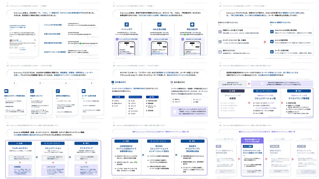 | X 広告規制変更に関する具体的な運用方法やアルゴリズムの変更後に効果が出た他社事例などをまとめています。 | ||||||||||||||
