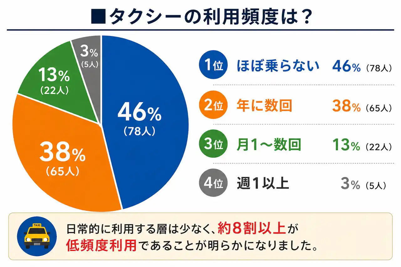 今回の調査では、タクシー料金値上げに対し「理解はあるが負担が大きい」というユーザー心理が明確に示されました。特に、もともと利用頻度が低い層が多い中での値上げは、さらなる利用減少を招く可能性があります。 |