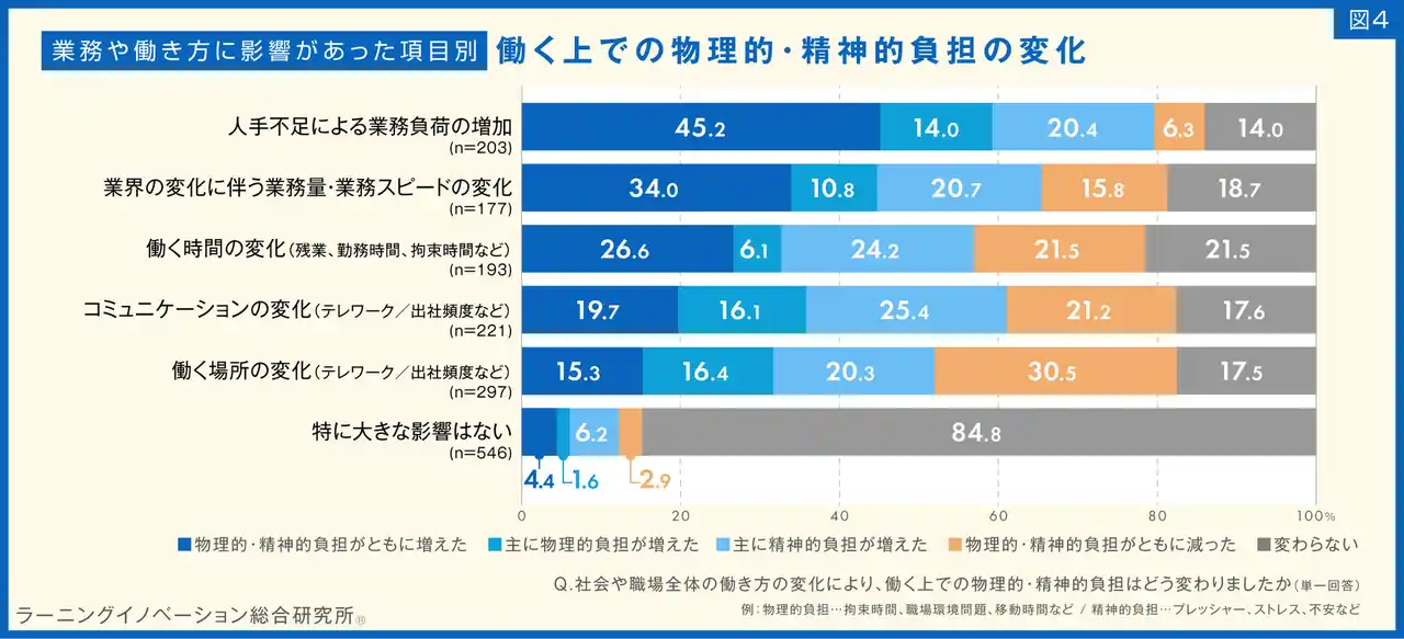 社会や職場全体の変化に伴い、業務や働き方に影響を受けたとする項目ごとに、働くうえで物理的・精神的負担の変化を感じている人の割合がどれほどか分析しました。 |