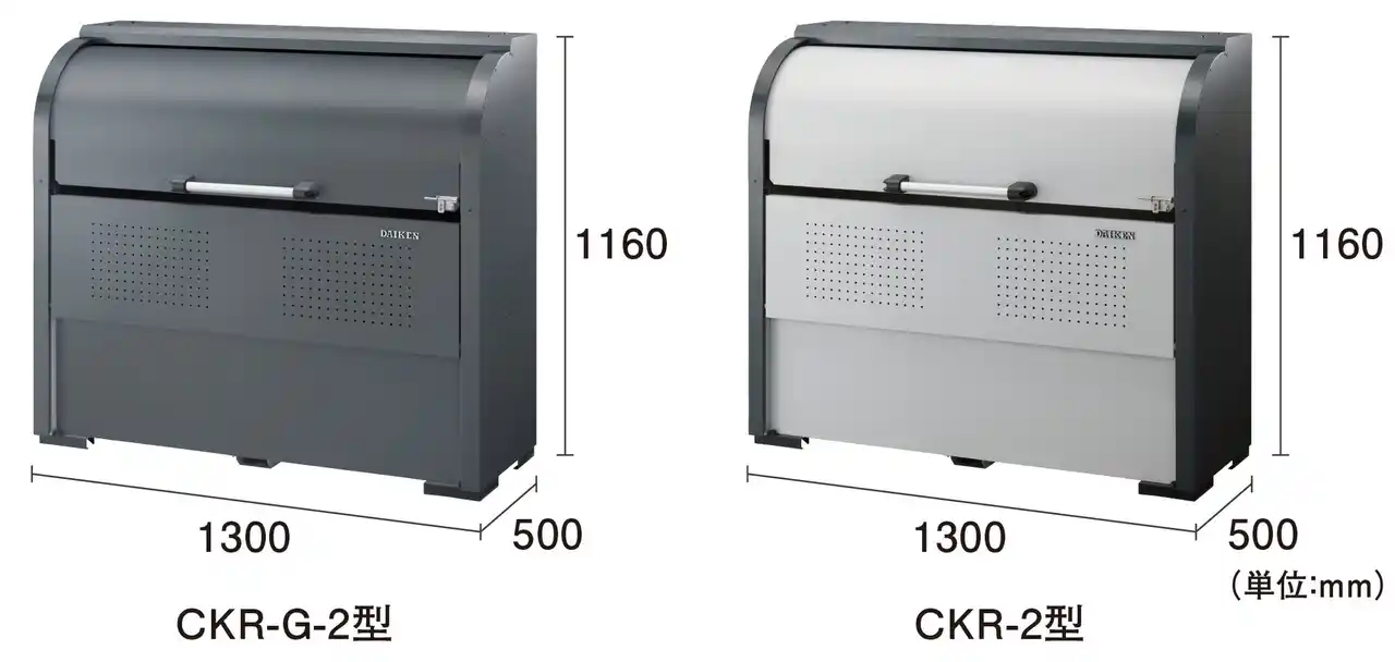 今回発売する「奥行500mmサイズ」は、建物の入口付近や道路に面した場所など狭小地への設置に最適。カラーバリエーションは2色あり、「CKR-G-2型」は全体がシックで高級感のあるダークグレーカラー、「CKR-2型」は前面のホワイトと側面・上部がダークグレーのツートンカラーが特長です。材質は、耐久性に優れた高耐食溶融めっき鋼板製。開閉音が静かになるロータリーダンパーを標準搭載し、ダンパー非搭載時と比べた場合に、扉の開閉音を約25%低減します。奥行500mmサイズの追加により、「CKR-G-2型」は計8サイズ、「CKR-2型」は計12サイズのラインアップとなりました。 |