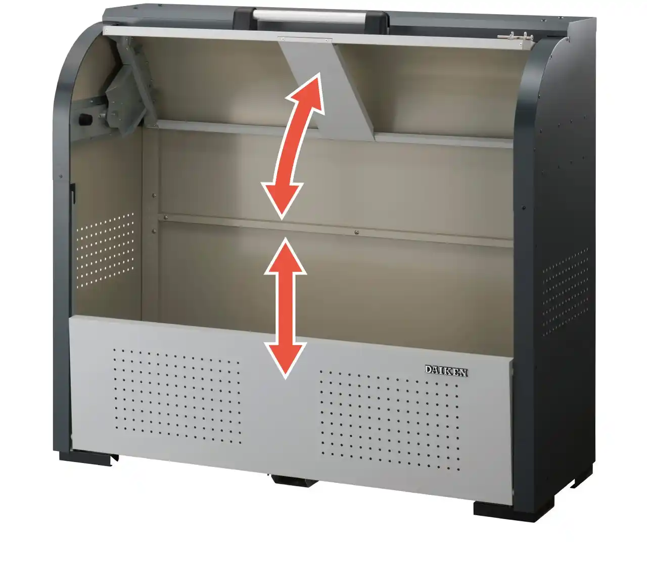 上部の扉は本体内部に納まる回転式、前扉は前面にスペースがなくても開閉可能な上下スライド式を採用。限られた設置環境でも、空間を有効に活用します。 |