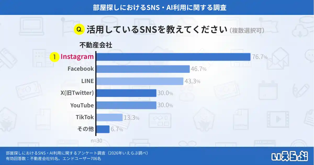 不動産業界特化のDX支援サービスを展開する、株式会社いえらぶGROUP(本社:東京都新宿区、代表取締役:岩名泰介、以下「いえらぶGROUP」)は、不動産会社・エンドユーザーに対して「部屋探しにおけるSNS・AI利用に関するアンケート調査」を実施しました。有効回答801件の調査結果を発表します。