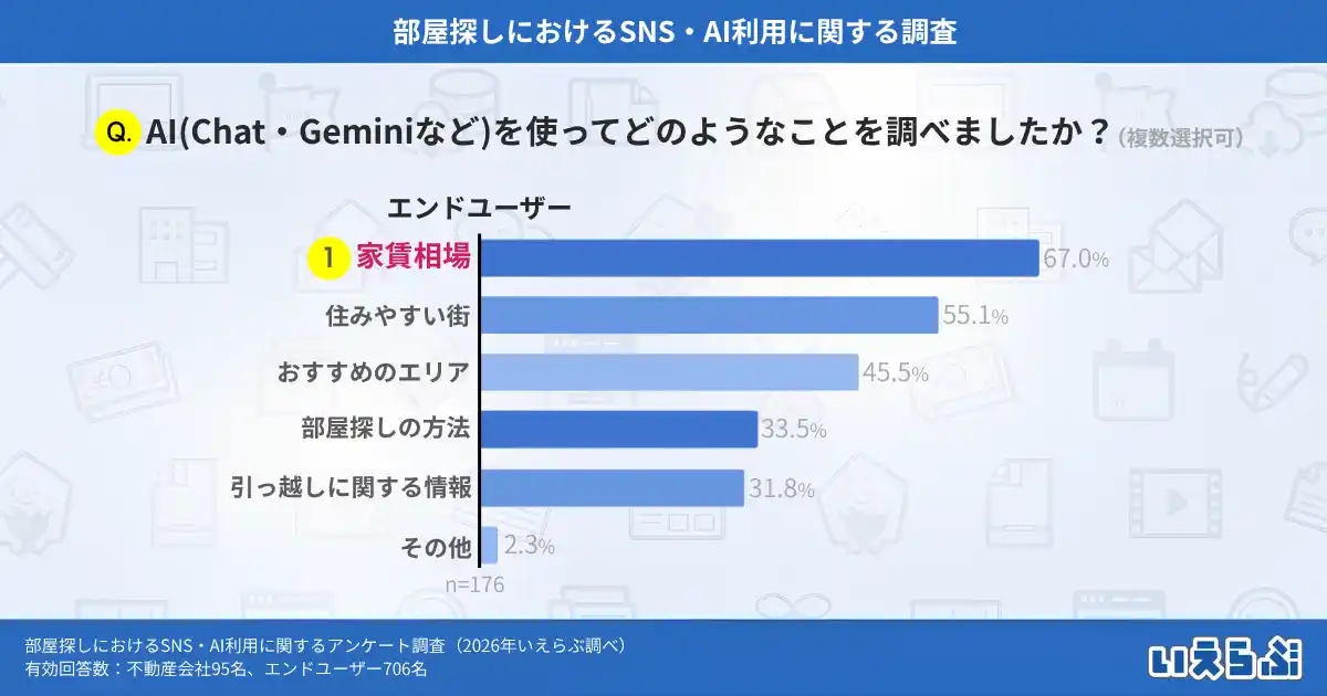 部屋探しにおいて、AIを「積極的に利用している」「時々利用している」と回答したエンドユーザー(※4)に「AIを使ってどのようなことを調べましたか?」という質問をしたところ、「家賃相場」という回答が最も多く67.0%でしたが、「住みやすい街」(55.1%)、「おすすめのエリア」(45.5%)と、エリア選びに関する回答も多く見られました。 |