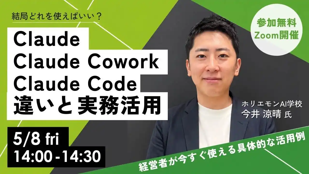 ホリエモンAI学校株式会社(本社:東京都新宿区、代表取締役CEO:荒木 賢二郎、以下「ホリエモンAI学校」)は、5/8(金)14:00-14:30Claudeの波に乗り遅れてしまった経営者向けに『【30分で理解】Claude Code入門ウェビナー』を開催いたします。 |
