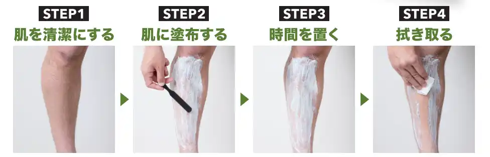 除毛する部分を洗い流すか、濡れタオルで拭く。その後、水分はしっかり拭き取る。 |