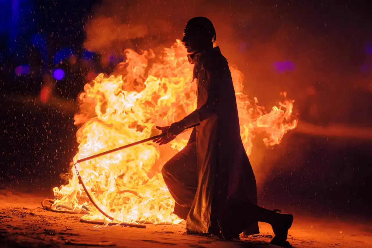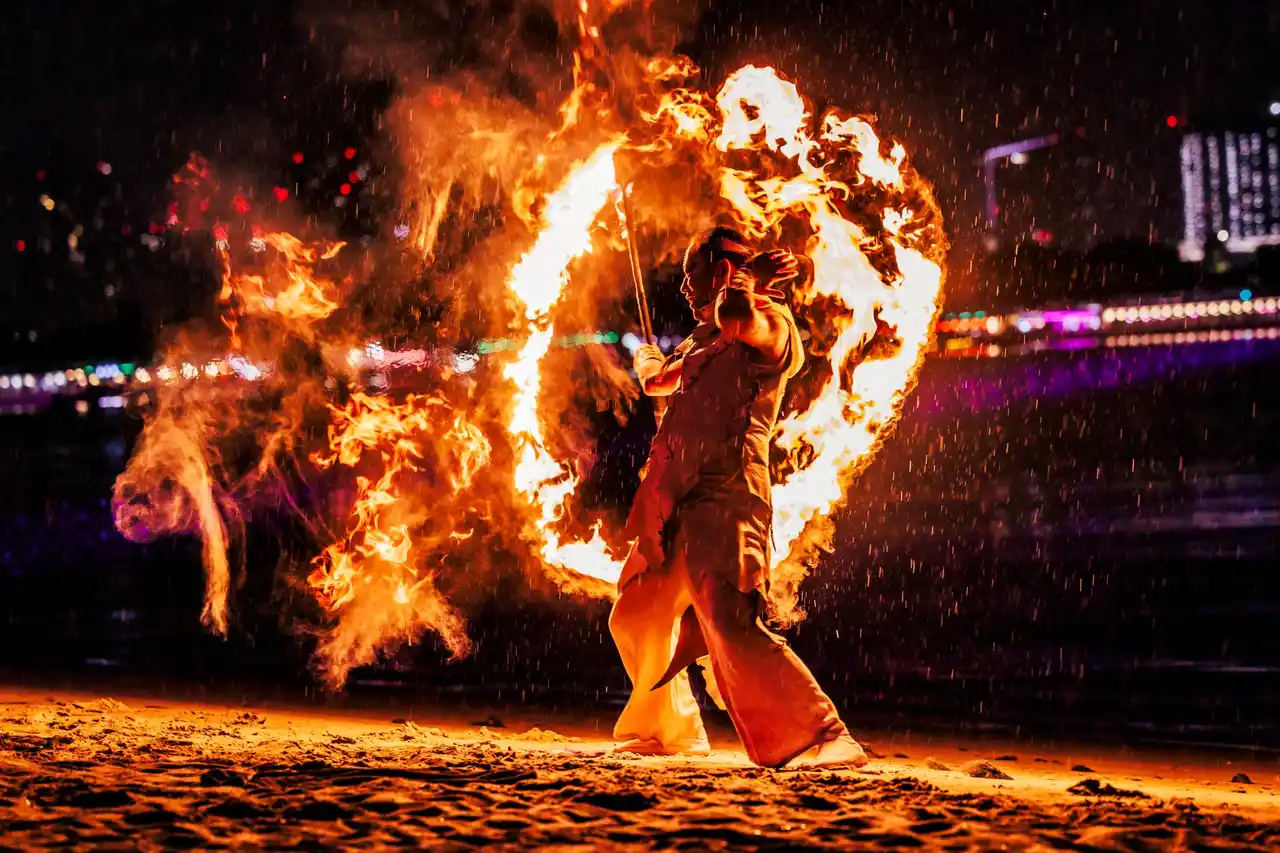 LEDやレーザーなどの光演出と、伝統的なファイヤーパフォーマンスを融合させた |