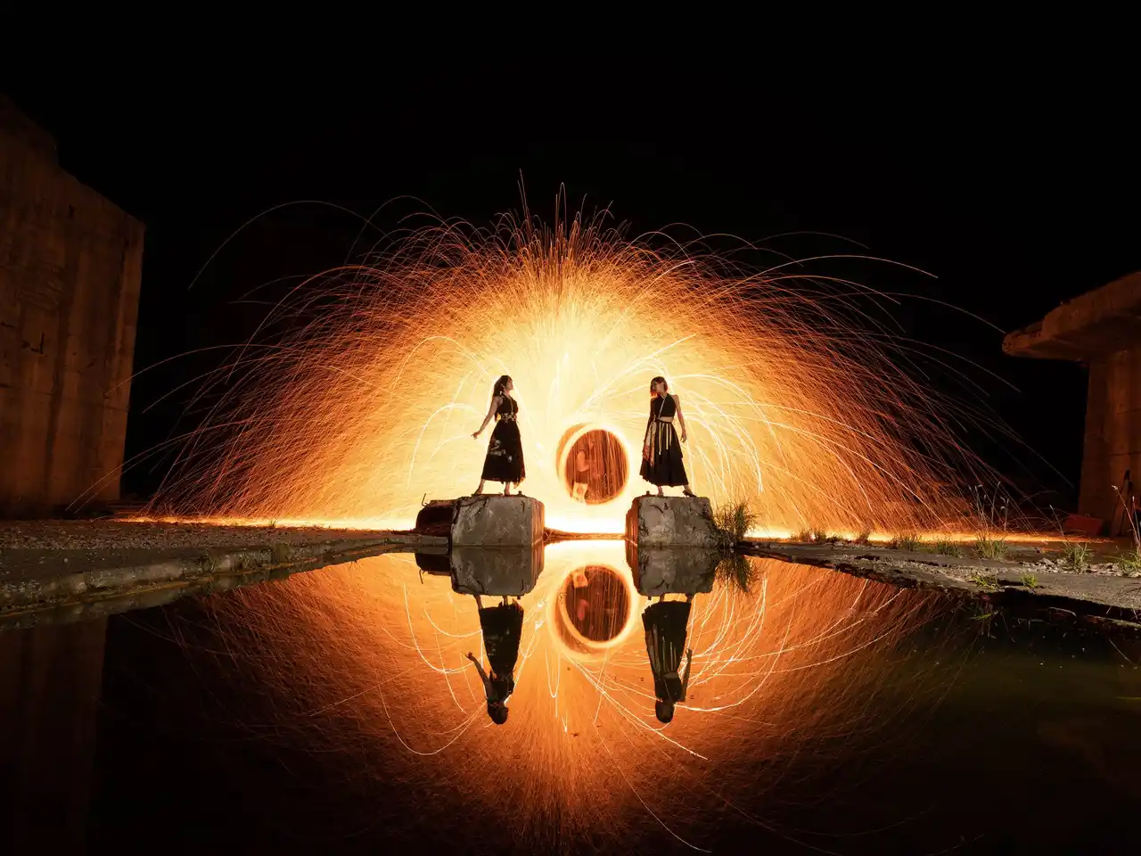 炎と水、水面に映り込む光の軌跡 |