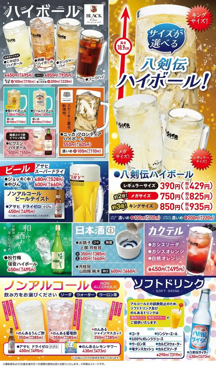 八剣伝 堀切菖蒲園店(東京都葛飾区)・金剛駅前店(大阪府大阪狭山市)の2店舗にて、やきとり・くし焼き全品を対象とした60分食べ放題を1,500円(税込1,650円)で実施。さらに、90分飲み放題も同じく1,500円(税込1,650円)