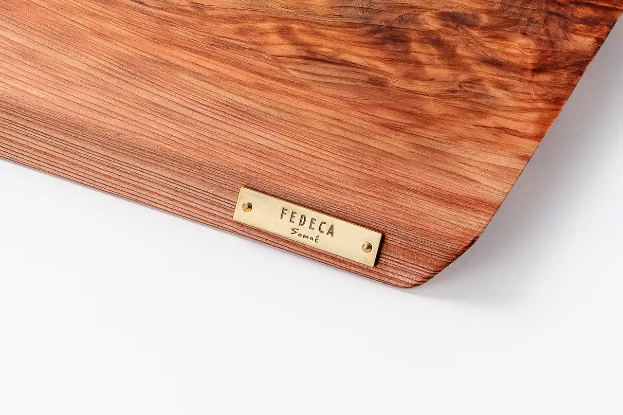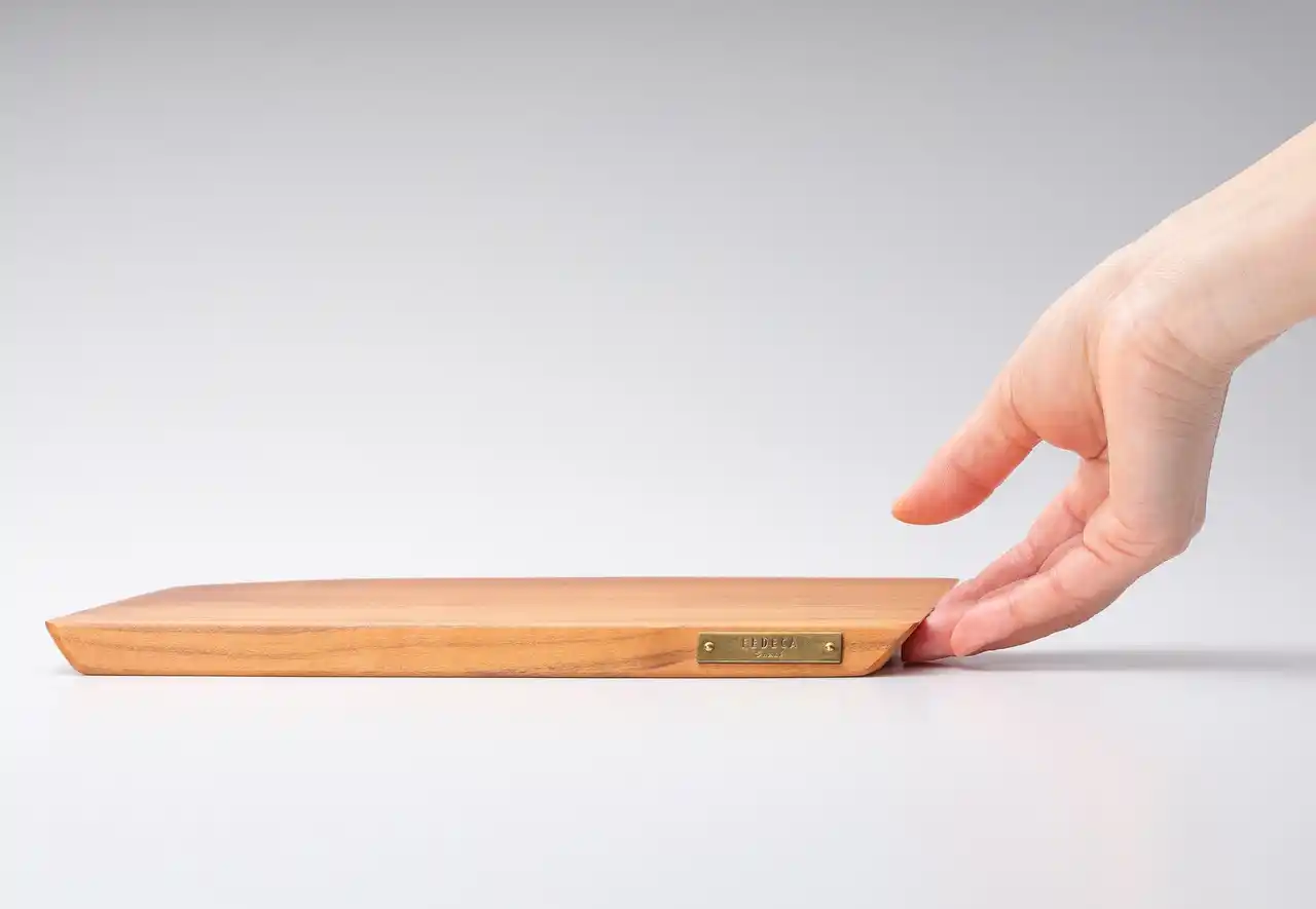 毎日使う道具だからこそ、端面には絶妙な傾斜を施し、指がスッと入って軽やかに持ち上げられる「機能美」にもこだわりました。有機的な木のラインを引き締める「真鍮製のブランドプレート」が、キッチンや食卓に凛としたアクセントを加えます。 |