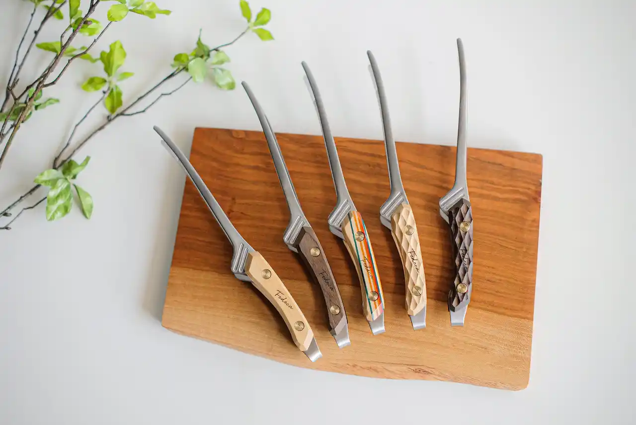 ミニマル包丁「corebacca」とお揃いで楽しめるよう、木柄のラインナップも充実。シンプルな「プレーン」、日本古来の削り跡を表現した「名栗」、食卓を鮮やかに彩る「マルチカラー」をご用意しました。燕三条の確かな金属加工技術と、感性を刺激するSomaeのハンドルが、いつもの食事をより豊かな時間へと変えてくれます。