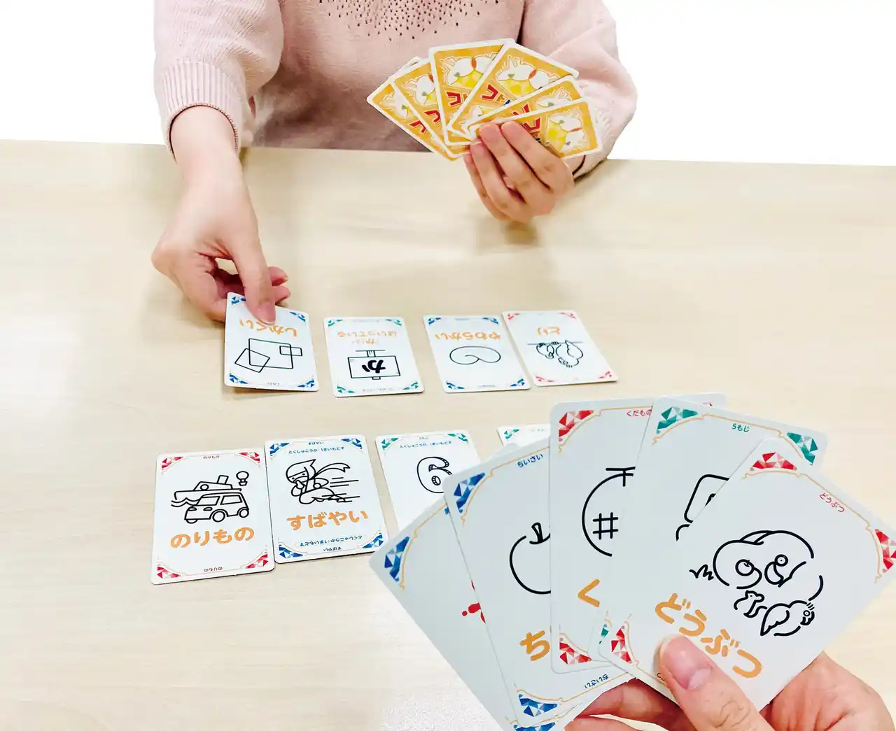 「あかい」「くだもの」「どうぶつ」「まるい」「5もじ」などが書かれたカードを配る。 |