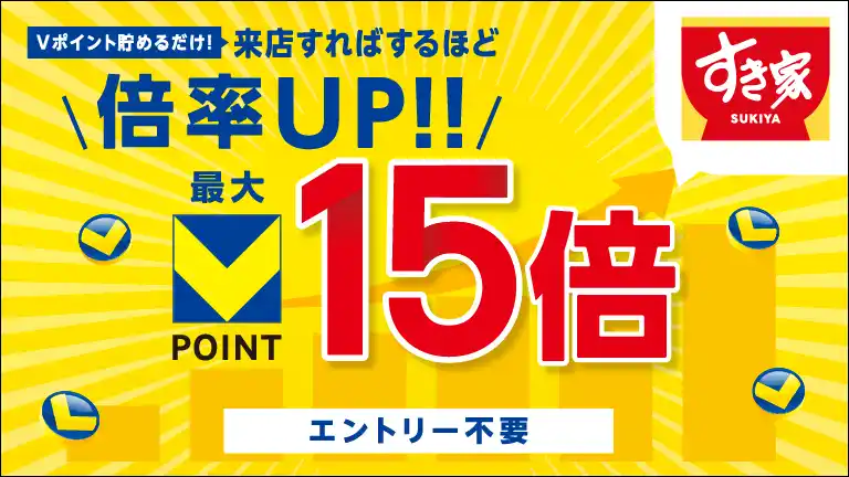 キャンペーン期間中、「すき家」店舗へのご来店時にモバイルVカードやTカードを提示いただくと、通常のお食事で貯まるVポイント(200円(税込)につき1ポイント)に加え、来店回数に応じて最大15倍のVポイントを進呈いたします。2回来店で2倍、3回来店で5倍、4回来店で10倍、5回以上の来店で15倍のVポイントが貯まります。 |