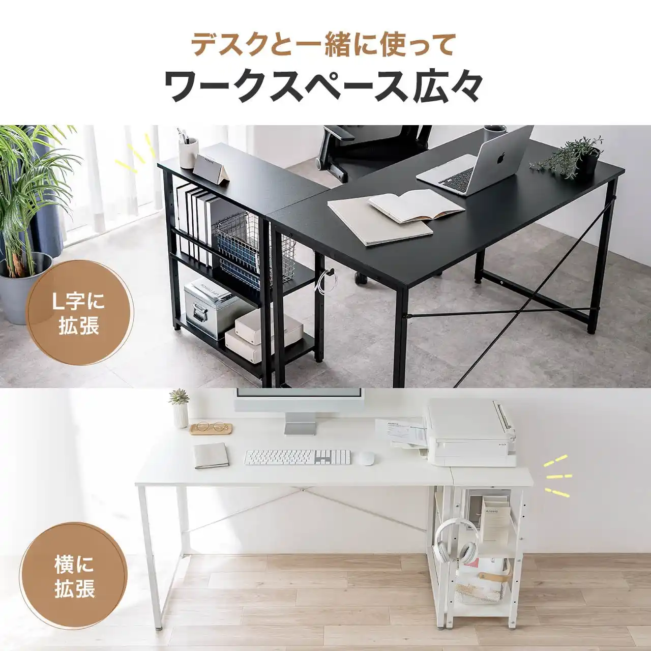 | 高さ70cmの本製品は、一般的なデスクと並べやすいサイズ設計です。デスクの横に置けば天板スペースを自然に拡張でき、L字型に配置すれば作業効率の高いレイアウトも実現できます。プリンタや書類、デスク周りの小物を手の届く場所にまとめられるため、限られたスペースでも快適なワーク環境を整えられます。 | |||||||||