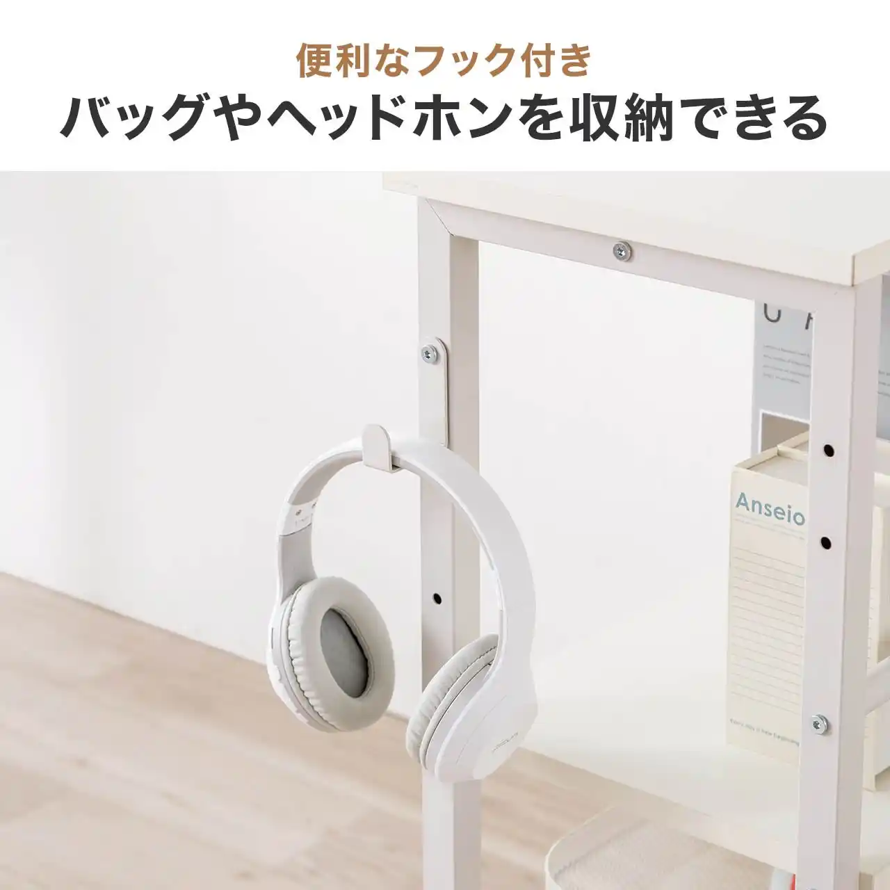 | 本製品には、バッグやヘッドホンを掛けられる便利なフックが付属しています。デスク周りに置き場所がなく散らかりがちな小物も、サッと掛けるだけですっきり収納できます。さらに天板には、傷や汚れに強いメラミン化粧板を採用。飲み物をこぼしてしまった時も拭き取りやすく、日常使いにぴったりです。収納力だけでなく、使いやすさにもこだわったオープンラックです。 | |||||||||