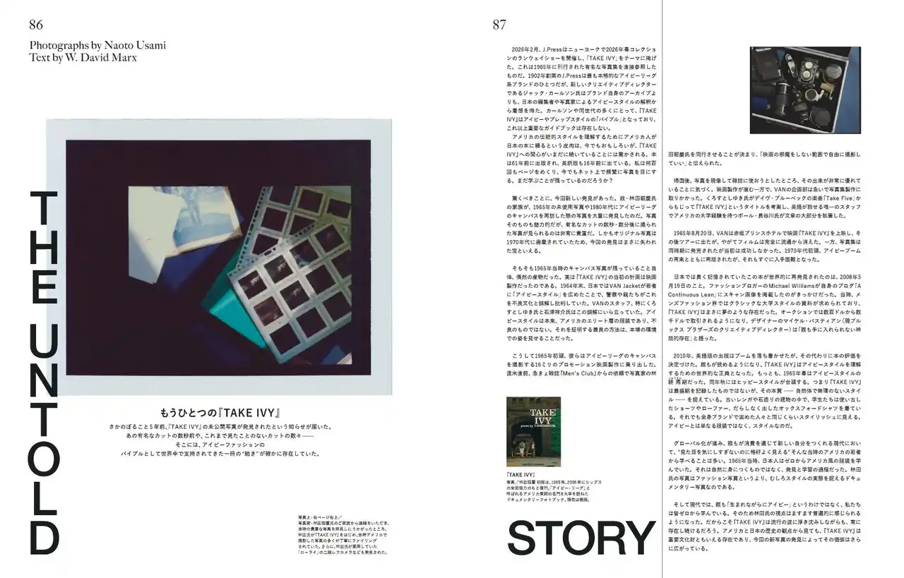 アイビーファッションのバイブルとして、今や世界中で神格化されている伝説の写真集『TAKE IVY』。本企画では、1960年代にアメリカ東海岸のアイビーリーグの日常を捉えた、これまで一度も世に出ることがなかった写真を本邦初公開。日本のファッションカルチャーを鋭く分析した名著『AMETORA(アメトラ)』の著者、デーヴィッド・マークス氏を招聘し、アイビーの本質を単なる一過性の「ファッション」ではなく、確固たる「スタイル」として定義します。伝説のバイブルが現代においていかなる価値を持ち、なぜ今もなお私たちの規範であり続けるのか。秘蔵の写真群とともに、撮影当時の知られざる舞台裏と、アイビーの真髄を再考する永久保存版のコンテンツです。 |