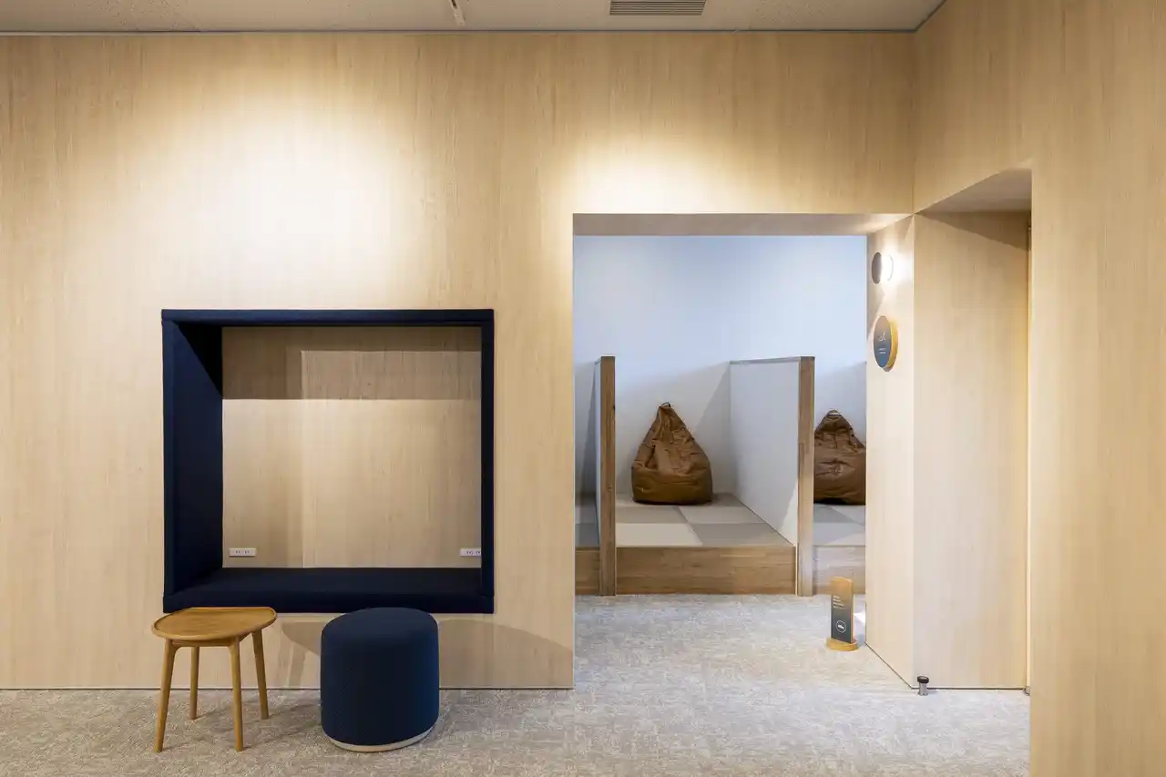 | 自然光を感じながら作業できる「まどぎわラウンジ」、靴を脱ぐ小上がりタイプの「くつろぎラウンジ」、心身を整える「瞑想ルーム」、Web会議に集中できる防音個室「フォンブース」など、特徴の異なる多様な空間を完備。気分に合わせて最適な居場所を選択でき、ワーカー一人ひとりのウェルビーイングを高めます。また、エントランスにはオフィスアロマを導入し、オン・オフの切り替えができるように配慮しています。 | ||||||||||||||||