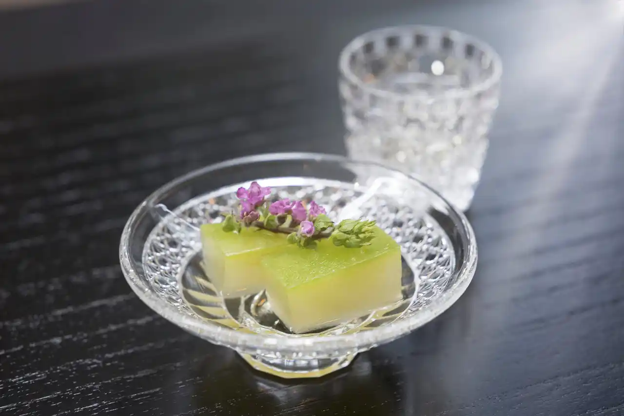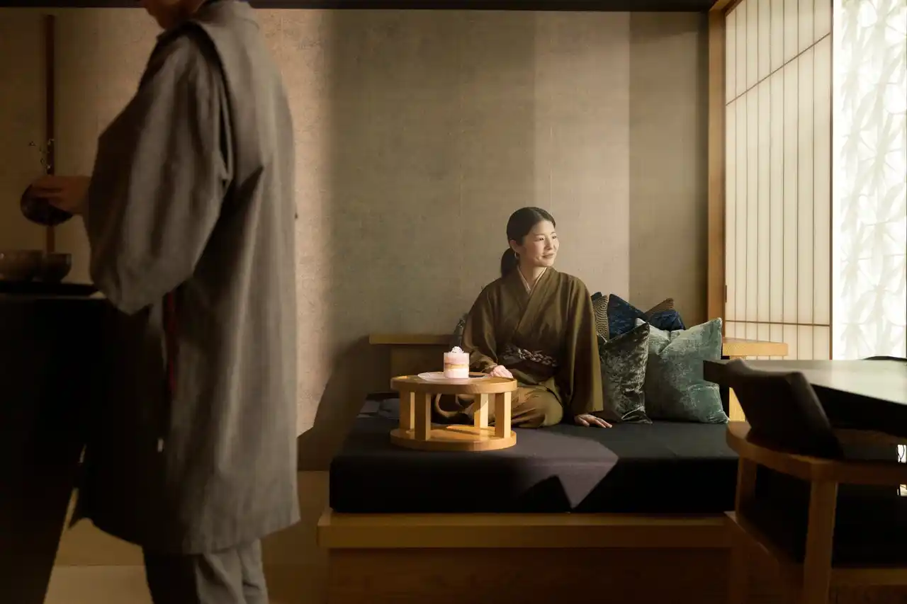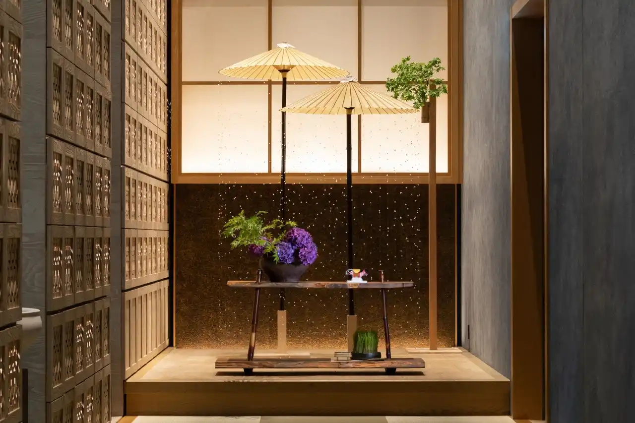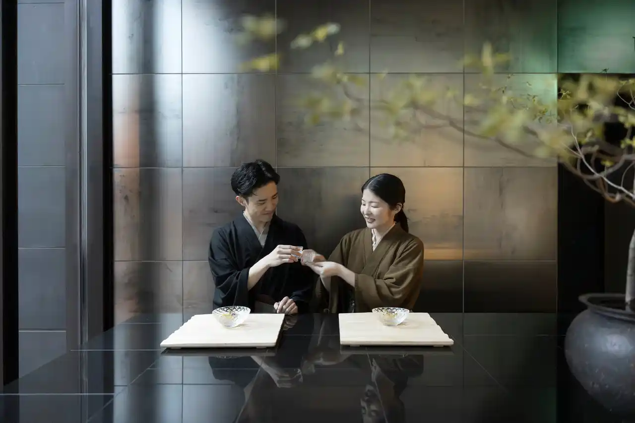 | オフィス街の喧騒を抜け一歩足を踏み入れると、打ち水で冷やされた清涼な空気がお客様を包み込みます。玄関の青森ヒバの扉をくぐると、正面の縁台には紫陽花やナツハゼなどの瑞々しい季節の草花が彩る室礼が置かれ、目からも涼を届けます。お茶の間ラウンジで供されるのは、煎茶と季節のお茶菓子。畳に足を伸ばし、都会の熱気を忘れて静寂へと心が切り替わる、滞在の始まりを告げる特等席です。 | |||||||||
