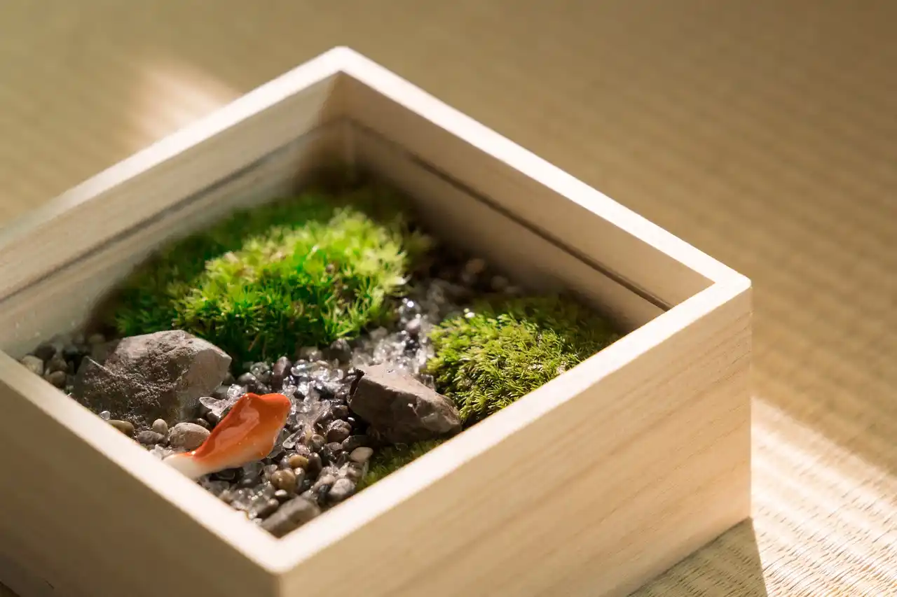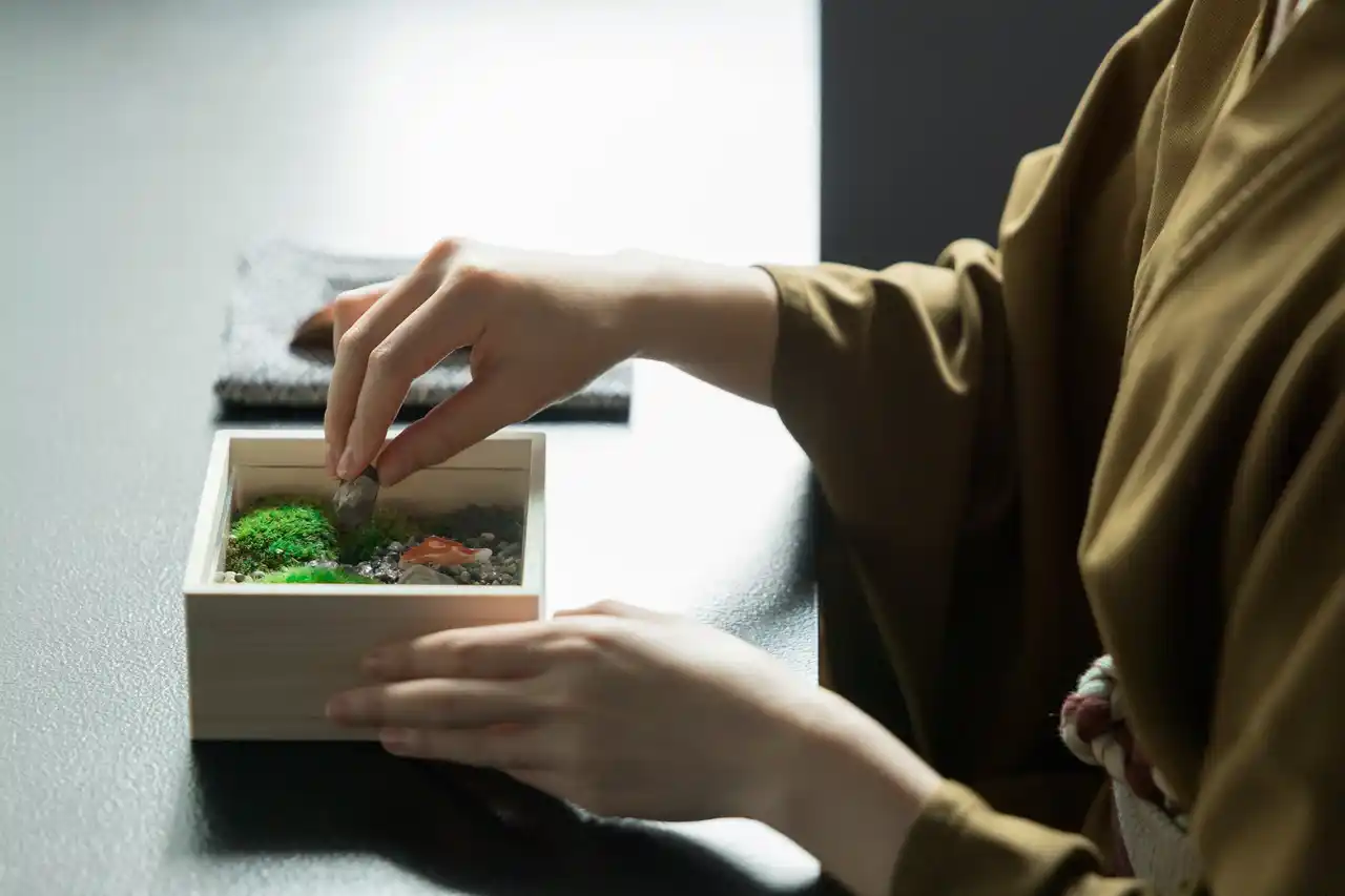 | 出発前には、江戸の園芸文化に倣い、自分だけの夏の涼を表現する「箱庭づくり」に没頭します。桐箱の中に、慈雨を受けた深緑の苔や、岩間を流れる清水の情景を描き出します。石や苔に触れ、小さな箱庭に自然の気配をそっと映し出すひとときは、心に静かな涼をもたらします。都心の真ん中で季節を慈しむ、日本旅館での滞在を締めくくるクリエイティブな体験です。 | |||||||||