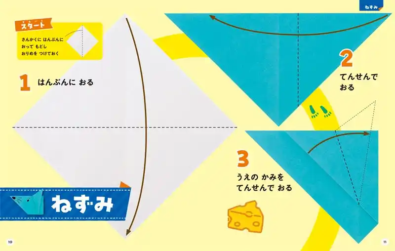 折り図の写真は、一般的な 15cm×15cmの折り紙で折ったときの原寸大です。折り線や角度、折り幅がはっきりわかるので無理なく「できあがり」までたどりつくことができ、お子さんの達成感までの道のりを、やさしく、しっかりとサポートします。 |
