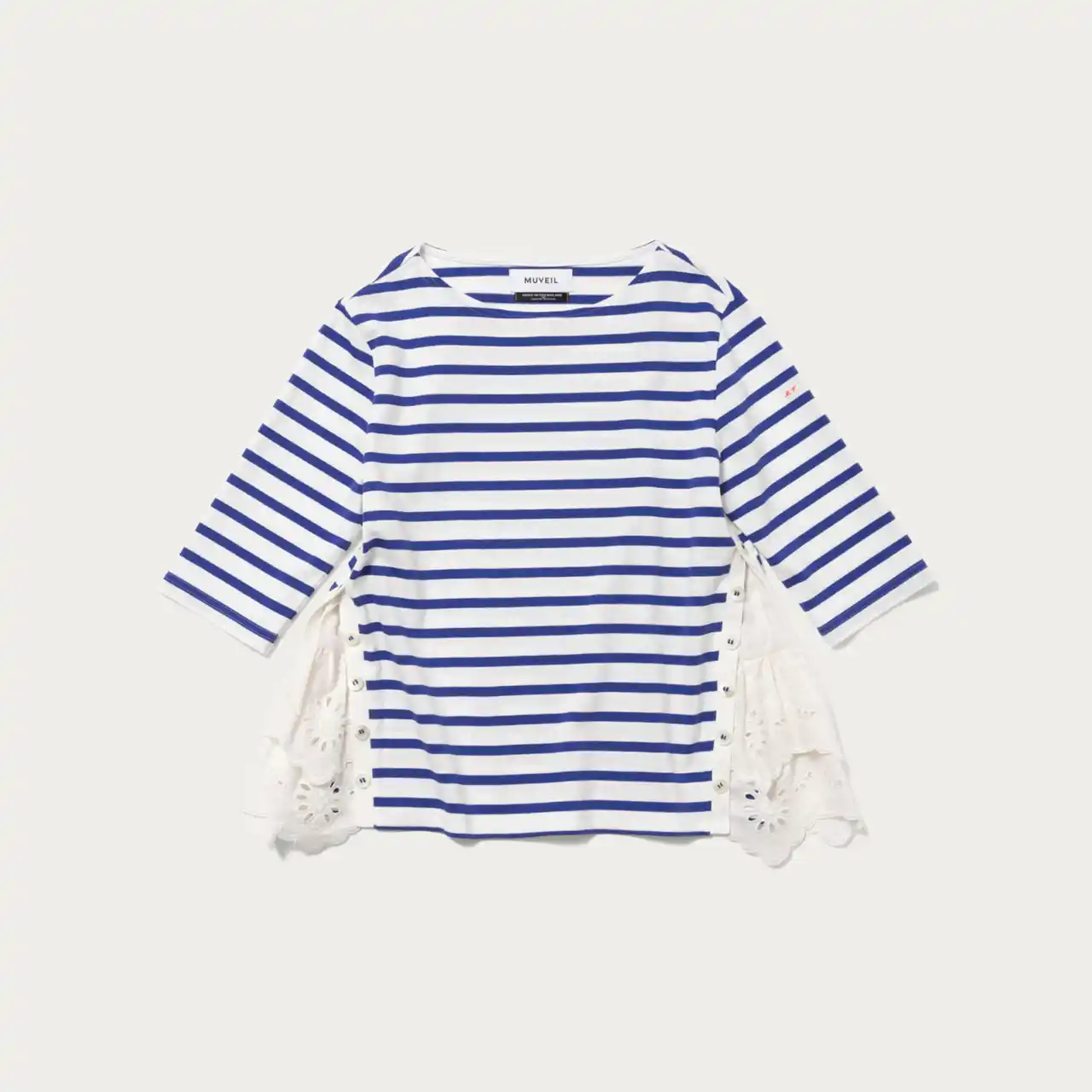 大人のリアルクローズを提案するブランド<MUVEIL(ミュベール)>。6分袖のトップスのサイドに施されたボタンが、着こなしの幅を広げます。ボタンを留めるとシンプルに、外すとレースが覗くデザインへと変化。シルエットが変わることで、シーンや気分に合わせて異なるスタイルを楽しめる一着です。さりげないデザイン性が、大人の装いに程よい華やかさを添えます。 |