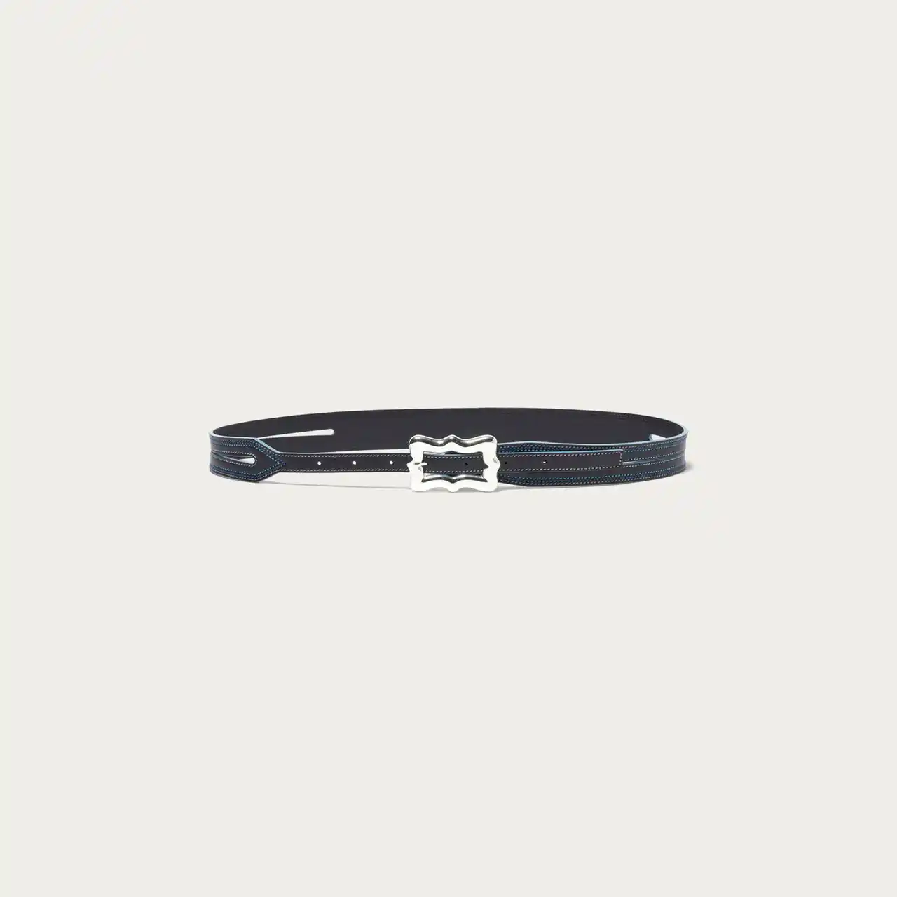 人気のリボンバックルが印象的なベルトを、コバとステッチを配色にした2026年春夏シーズンの新作モデルをベースに、カラーを別注しました。ブルーを基調とした配色がさりげないアクセントとなり、スタイリングに程よい変化をプラスします。カジュアルからきれいめまで合わせやすく、特にデニムスタイルとの相性が良いアイテムです。 |