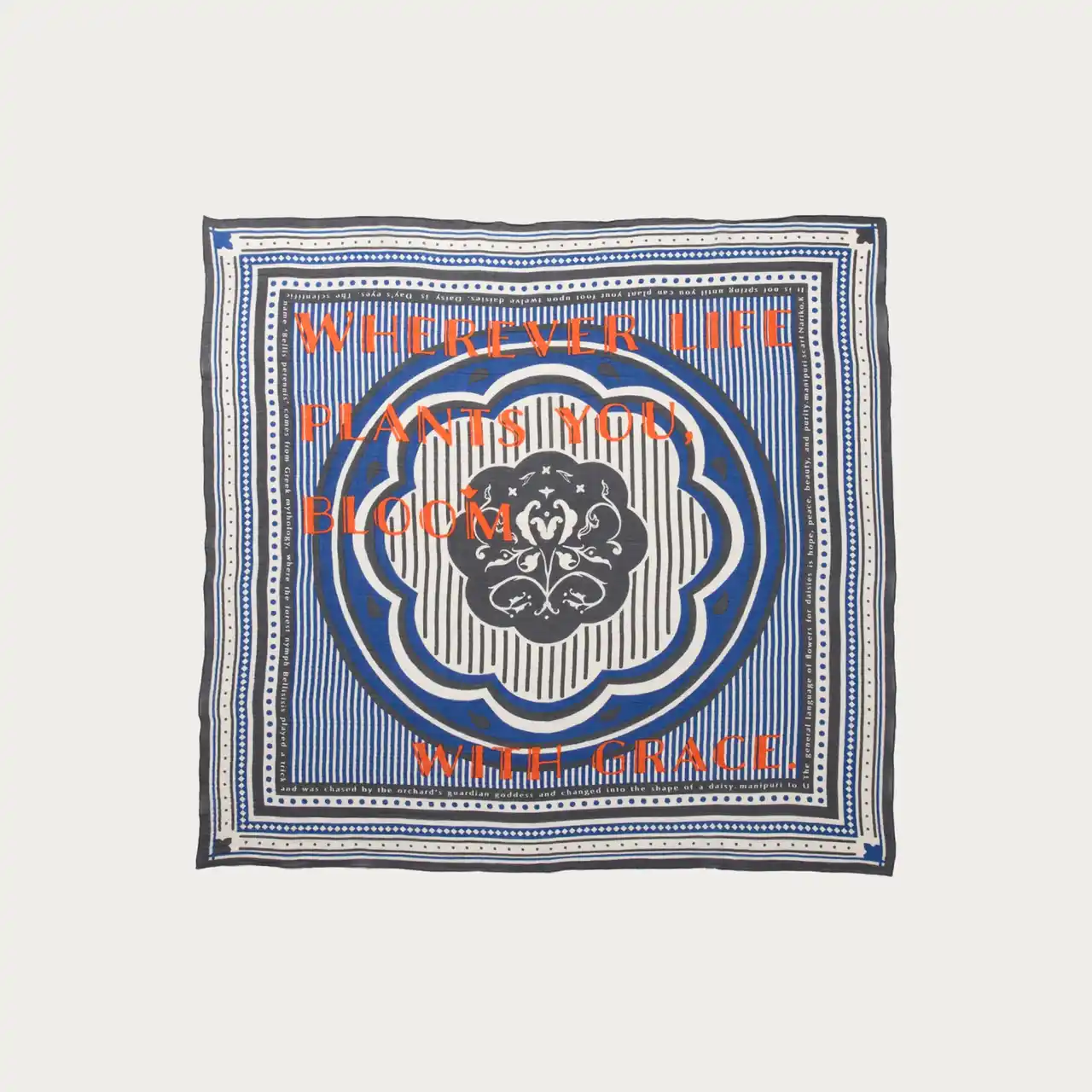 伝統的な手織りと最新機械を融合させた革新的なデザインが魅力のブランド<manipuri(マニプリ)>。ブランドの過去のアーカイブ柄をベースに、今回のプロジェクトテーマに合わせて特別にアレンジを加えました。さわやかなブルーのボーダーに、鮮やかなオレンジの文字を効かせた配色がポイントの一点です。コントラストのあるカラー使いが、これからの季節の強い日差しのもとでも映える、印象的なデザインに仕上げています。 |