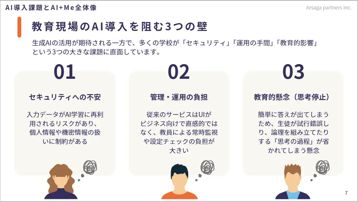 本資料では、教育現場でよく挙がるご意見をもとに、生成AI導入における複数の課題を提示。汎用的な生成AIでは障壁となる課題についても、AI+Meだからこそ実現できる解決策を分かりやすく解説しています。 |