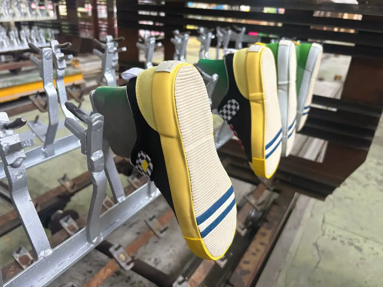 オリジナルスニーカーは、福岡県久留米市にあるムーンスター工場において職人により1足ずつ手作りしました。組み立てられた靴を加硫缶という大きな窯に入れ、一定時間熱と圧力を加えるヴァルカナイズ製法(加硫製法)で製作しました。生ゴムと中に練り込まれた硫黄が熱により化学反応を起こし、柔軟性と耐久性に優れた靴が出来上がります。この製法から生み出される靴には、ソールがしなやかで柔らかい、丈夫で壊れにくい、美しいシルエットが保てるという特徴があります。 |