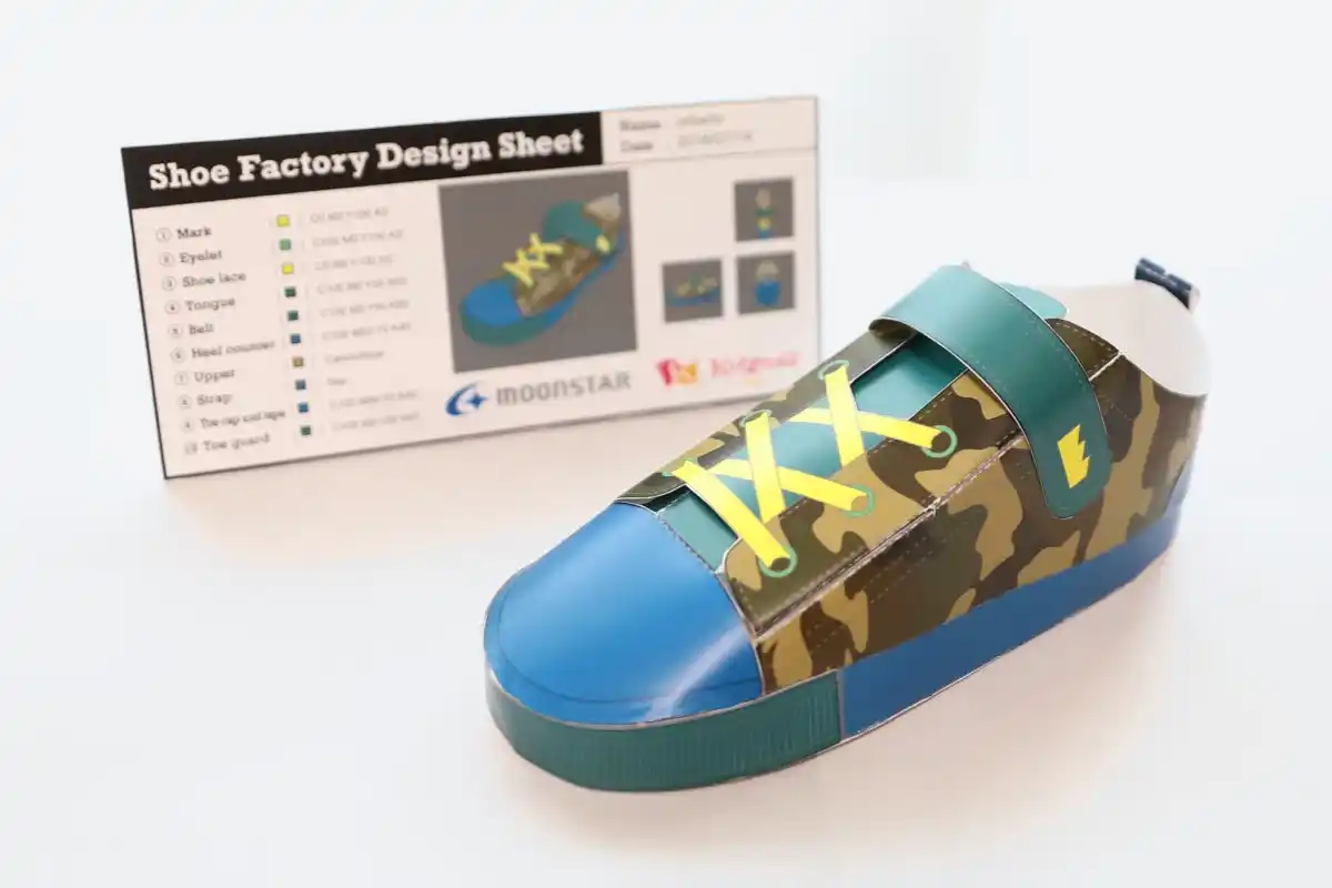「スニーカーデザインコンテスト」は、ムーンスターがオフィシャルスポンサーとして出展しているキッザニア東京・キッザニア福岡の『くつ工場』パビリオンで『くつデザイナー』の職業体験をした子どもたちの声から生まれたコンテストです。『くつ工場』パビリオンでは、『くつデザイナー』として、靴がたくさんのパーツからできていることや構造を学びます。その後タブレットを使ってパーツごとに色や模様を付け、自分だけのデザインを作り上げます。