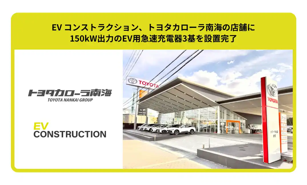 Terra Charge 株式会社のEV充電器の設置・施工を担う子会社EV Construction株式会社(本社:東京都港区、代表取締役:中川耕輔、以下「当社」)は、トヨタカローラ南海株式会社(本社:大阪府堺市、代表取締役社長:久保尚平、以下「トヨタカローラ南海」)のレクサス阿倍野、レクサス泉北、トヨタカローラ金岡店へ150kW出力のEV用急速充電器を設置完了いたしました。
