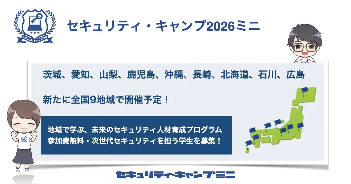 次代を担う若年層の情報セキュリティ人材の発掘・育成を目的とする一般社団法人セキュリティ・キャンプ協議会は、全国各地の教育機関・地域団体と連携し、学生を対象とした育成プログラム「セキュリティ・キャンプ2026ミニ(専門講座)」について、大阪(2026年3月)および東京(2026年4月)での開催に続き、このたび全国9地域での開催日程を発表します。 |