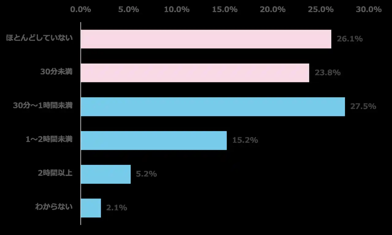また、「1時間以上」学習している割合は合計20.4%(1~2時間未満:15.2%、2時間以上:5.2%)にとどまり、学習時間の二極化傾向もうかがえます。 |