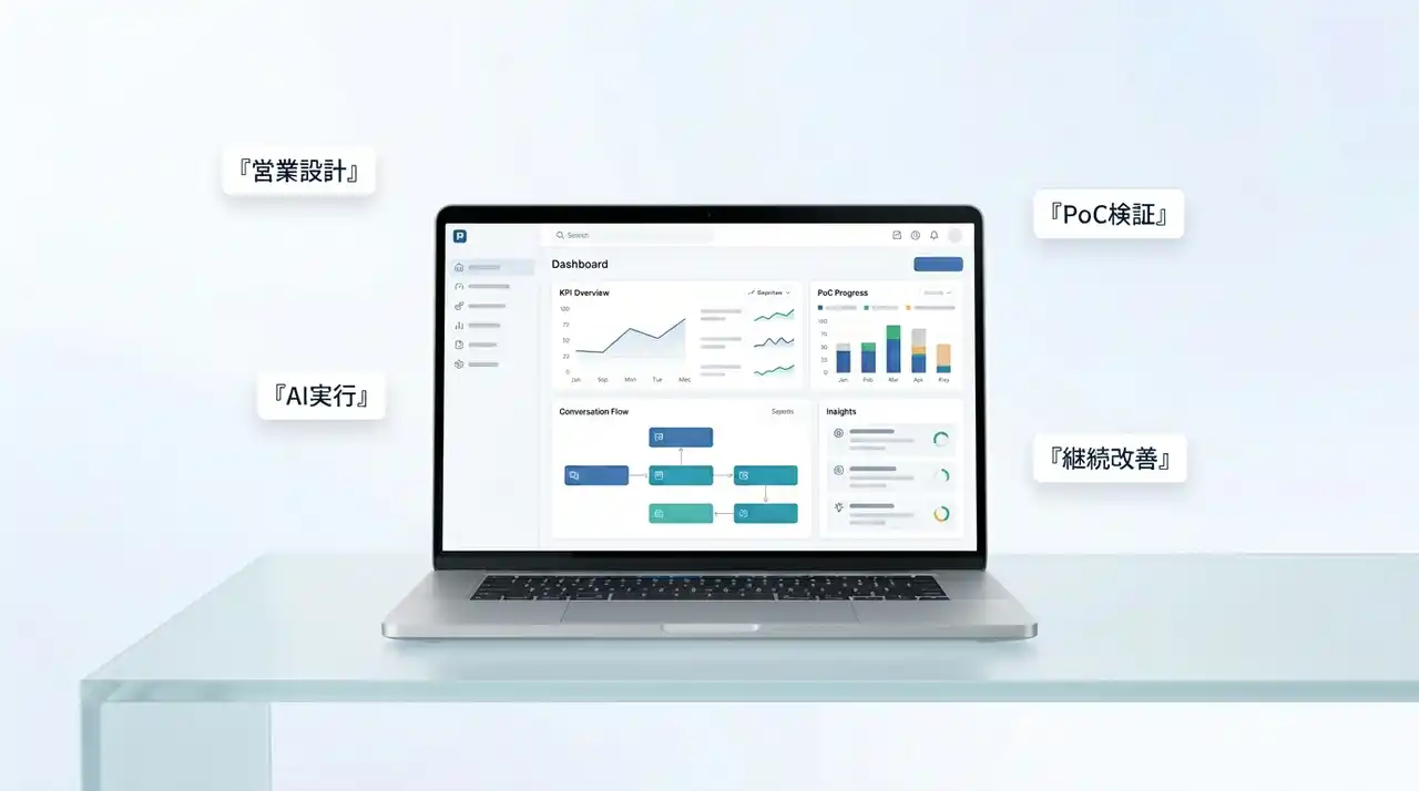 | 「SalesDNA AI」は、こうした営業現場の暗黙知を構造化し、営業活動における会話設計、AIによる実行、事前シミュレーション、PoC検証、運用データに基づく継続改善、人材育成までを一体的に支援するサービスです。営業成果の再現性向上と改善速度の加速を通じて、企業の営業組織全体の競争力強化を支援します。 | |||
