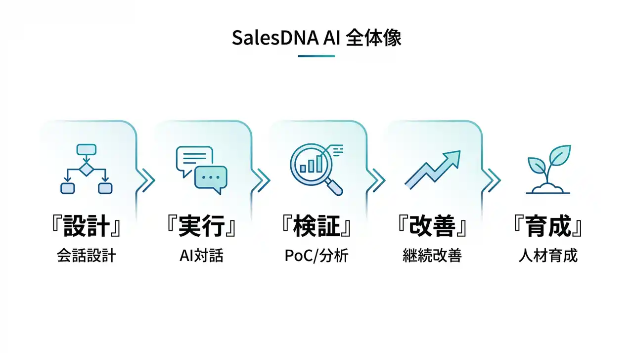| 「SalesDNA AI」は、営業活動における「設計」「実行」「検証」「改善」「育成」を個別最適ではなく、一連の循環として捉え直すことで、営業組織の再現性と改善速度の向上を目指すものです。 | |||