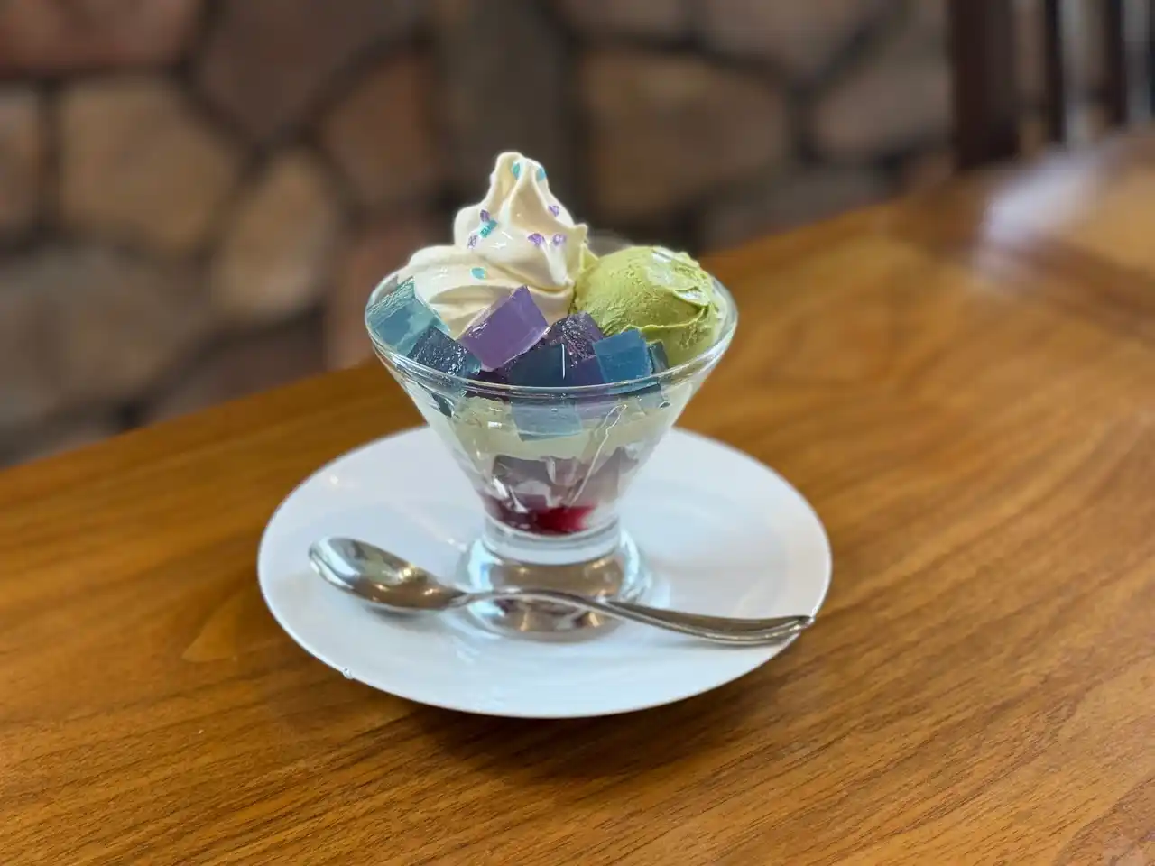1.商品内容 青と紫の寒天であじさいを表現し、濃厚なバニラソフトと深みのある抹茶アイス、白玉とあんこが入っており、黒蜜をかければコクのある甘さが口いっぱいに広がります。 |