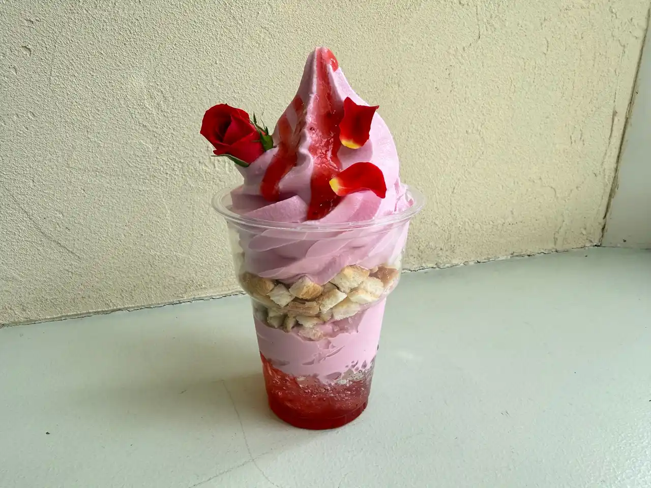 1.商品内容 バラのソフトクリームに食べれるバラ、ベリーソース、サクサクのラスクにキラキラ輝くクラッシュゼリーが楽しめる、この時期だけの特別な商品です。 |