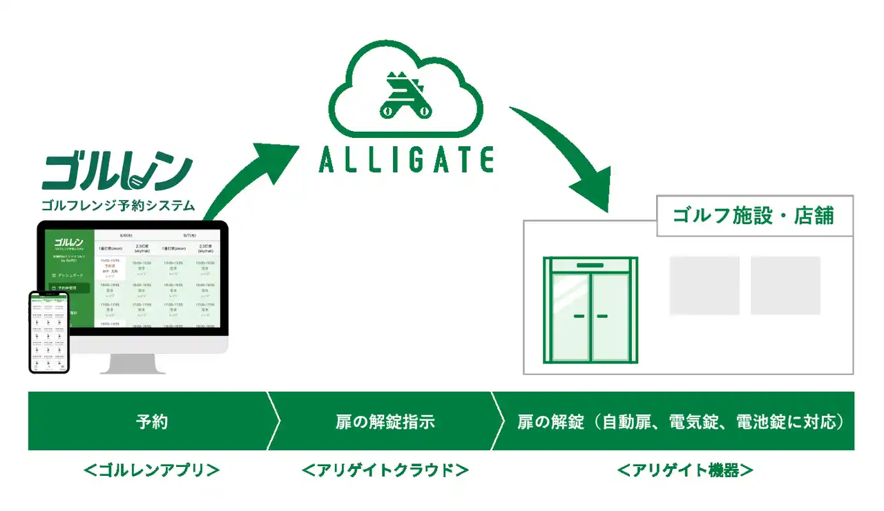 このような課題を解決するため、ゴルフ施設の運営に必要な機能に特化した予約システムである「ゴルレン」と扉の入退室権限を管理したり、入退室ログを取得したりするクラウド型の入退室管理システム「ALLIGATE」がシステム連携を行いました。本連携では、ユーザーがゴルレンで利用予約を行うとALLIGATEで管理する扉の入室権限がリアルタイムで付与されます。