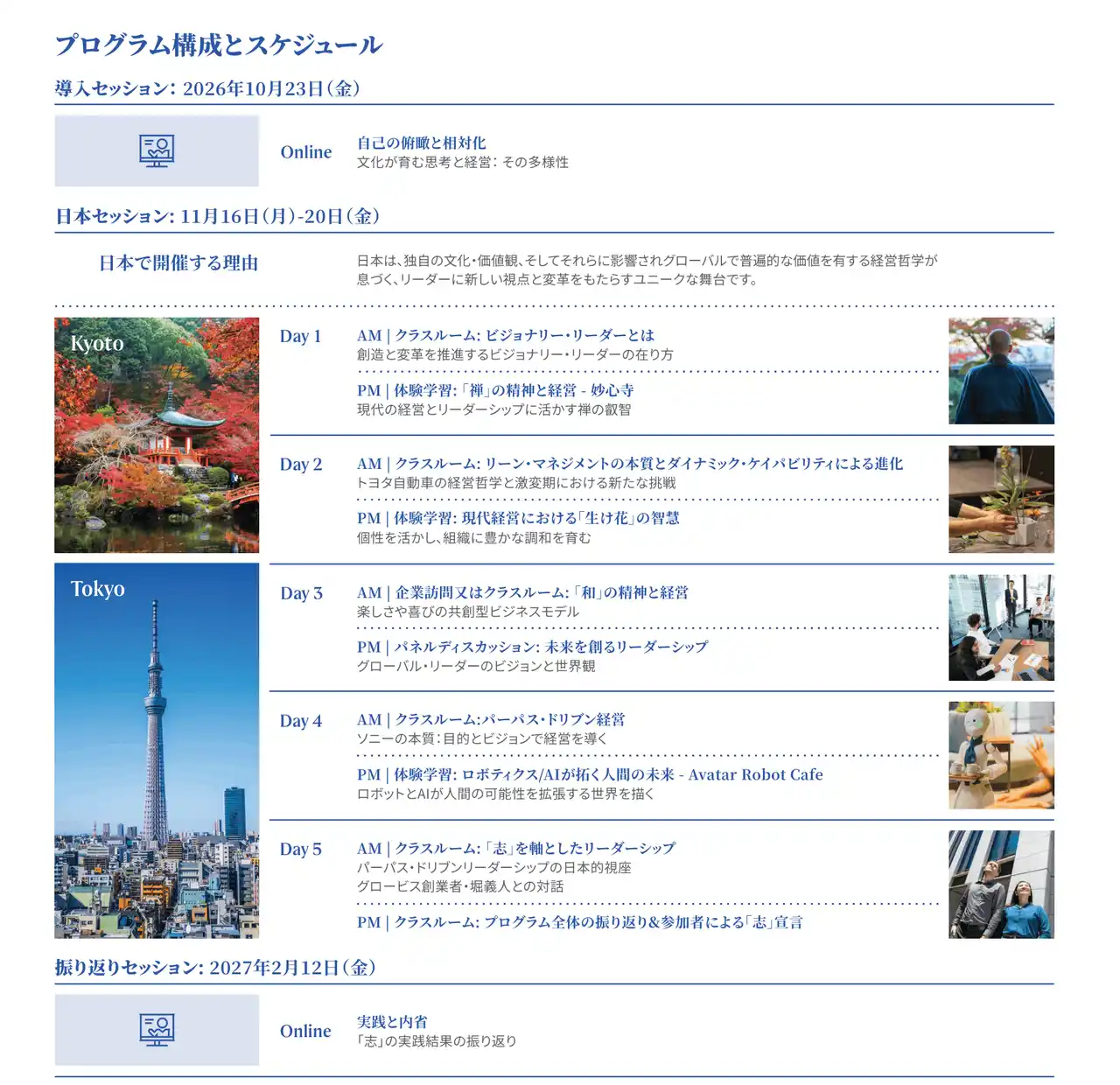 開講日: 日本:2026年11月16日(月)~20日(金) ※京都2日間+東京3日間、オンライン:2セッション(10月23日、2月12日 3時間のオンラインセッション ) |