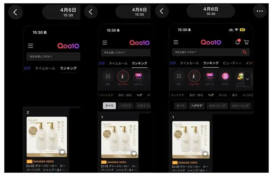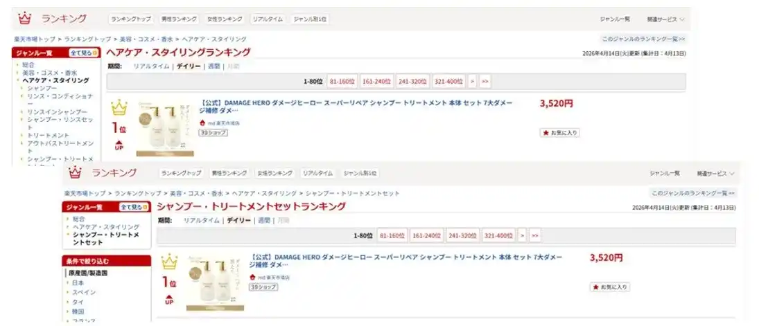 発売後からわずか2週間で、「ダメージヒーロースーパーリペアシャンプー&トリートメント本体セット」が、Qoo10のヘア部門において第1位、楽天市場のヘア・スタイリング部門においても第1位を獲得。発売直後から多くのお客様にご支持をいただいております。 |