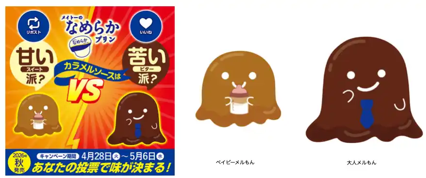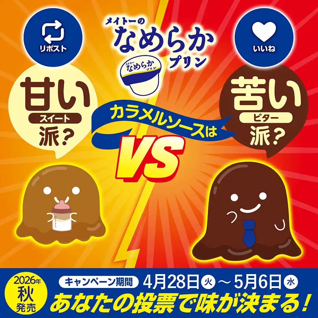 協同乳業株式会社(本社:東京都中央区、代表取締役社長:深松 聖也)は、SNSキャンペーン「あなたの投票で味が決まる! メイトーのなめらかプリン カラメルソースは甘い派?苦い派?」を2026年4月28日(火)よりXにて開始します。本キャンペーンは、2026年秋頃発売予定の「メイトーのなめらかプリン」の、カラメルソースの甘さをみなさまの投票で決める消費者参加型企画となっています。 |