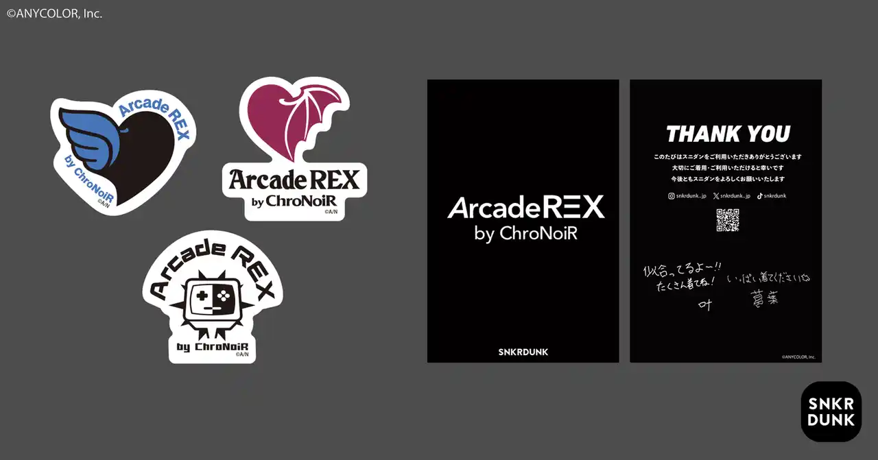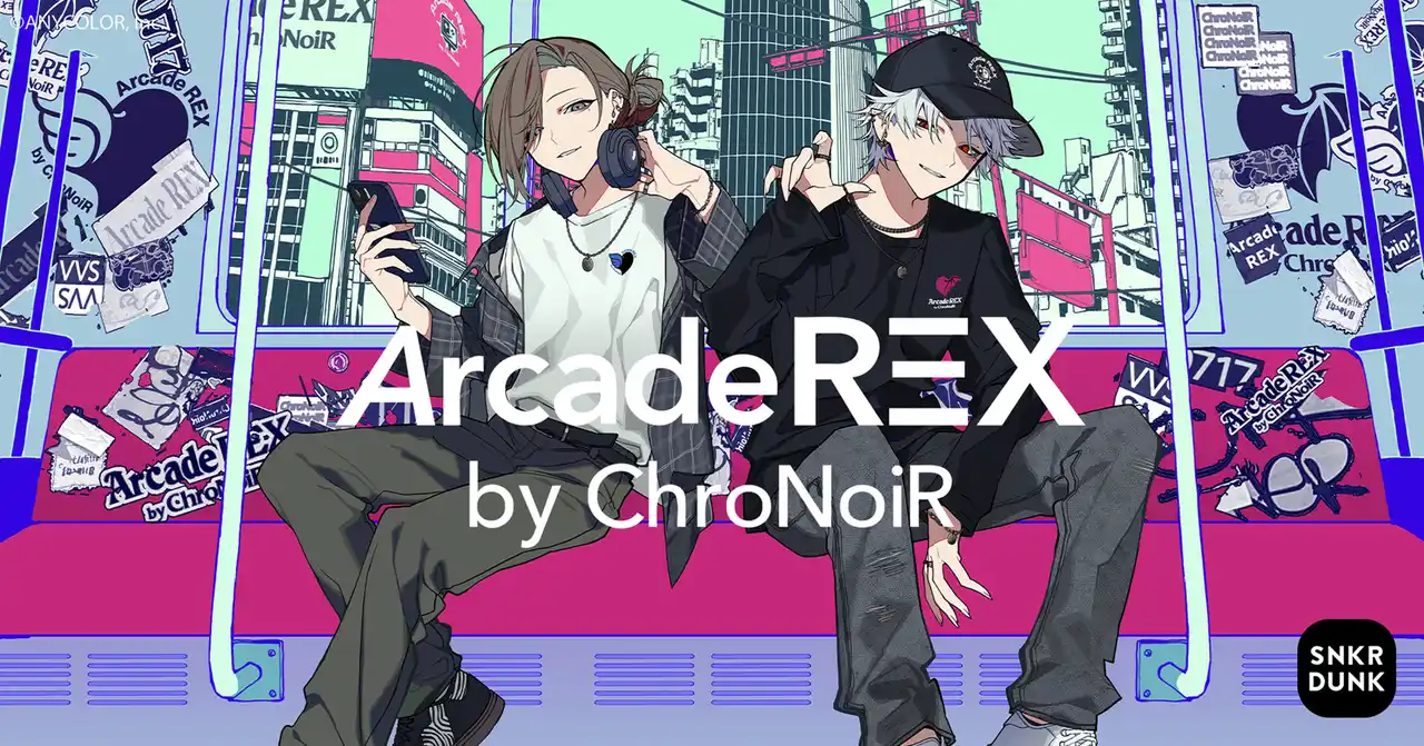 「SNKRDUNK(スニーカーダンク)」(以下、スニダン)を運営する株式会社SODA(本社:東京都渋谷区、代表取締役CEO:内山 雄太、以下SODA)は、ANYCOLOR株式会社(本社:東京都港区、代表取締役CEO:田角 陸)が運営する「にじさんじ」所属のユニット「ChroNoiR(クロノワール)」とスニダンのコラボアパレルブランド「Arcade REX by ChroNoiR(アーケードレックス バイ クロノワール)」から、第2弾となるファッションアイテムを2026年4月28日(火)より、スニダンアプリで販売いたします。 |