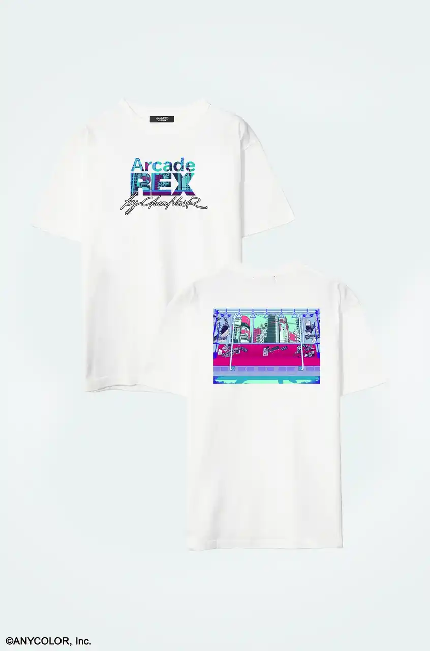 フロントには「Arcade REX by ChroNoiR」のロゴの中に、バックプリントと連動した都会的でサイバーパンクな風景が切り取られている。 |