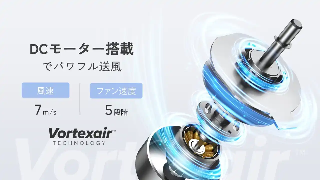小型ながら高性能DCモーターを搭載し、最大風速約7.0m/sを実現。しっかりとした風量で、蒸し暑い季節の不快感を軽減します。また、独自の特許技術 「Vortexair(ヴォーテックスエアー)テクノロジー」 により、空気の流れを効率的にコントロールし、自然に近いやさしい風を届けます。 |