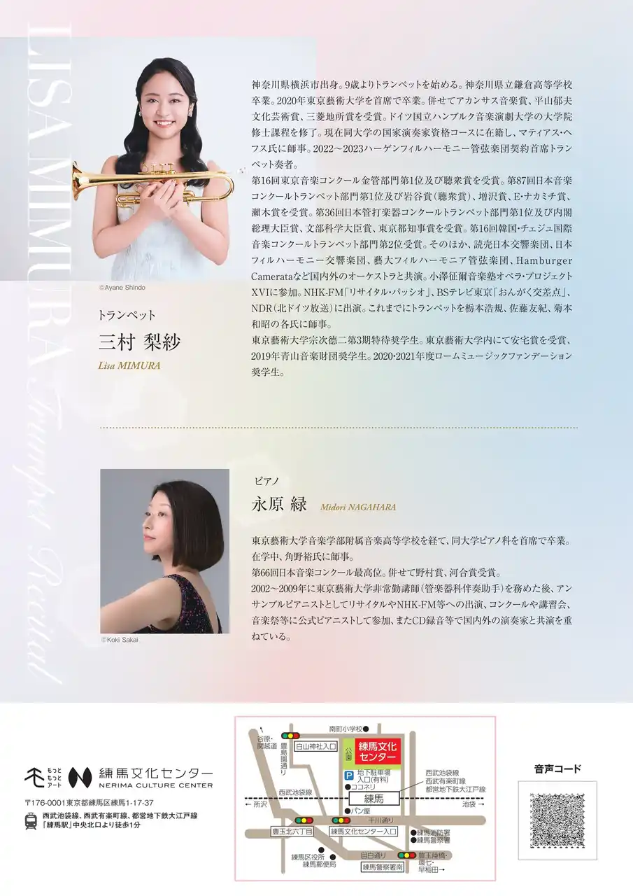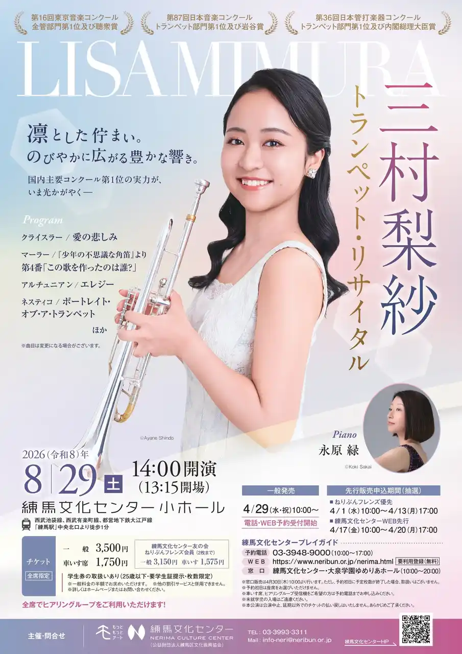 2026年8月29日(土)に練馬文化センター・小ホールにて、「三村梨紗 トランペット・リサイタル」を開催いたします。 |