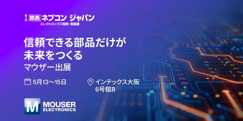 新製品投入(New Product Introduction: NPI)の業界リーダー(TM)として、イノベーションを推進する Mouser Electronics(マウザー・エレクトロニクス 本社:米国テキサス州マンスフィールド、以下マウザー)は、2026 年 5 月 13 日(水)~15 日(金)にインテックス大阪にて開催される「関西ネプコンジャパン」に出展いたします。本展示会は関西地域で唯一のエレクトロニクス開発・実装展で、電子機器の開発・製造に関わる企業620 社が出展予定です。 会期中はマウザーブースにて公式 SNS をフォローいただいた方を対象に、オリジナルエコバッグをプレゼントいたします。 |